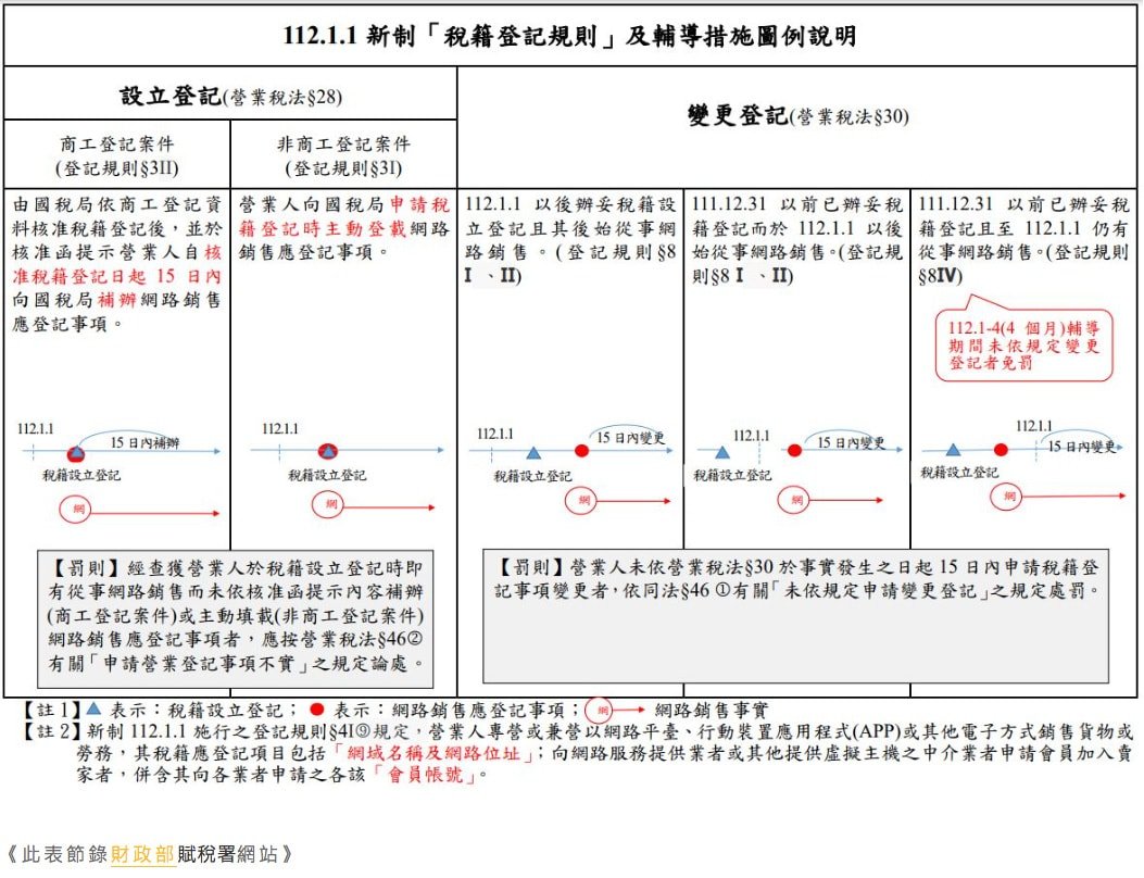 另訂自112年1月1日至同年4月30日止(計4個月寬限期),營業人於寬限期間內未依規定辦理變更登記增列網路銷售應登記事項者,免處行為罰。